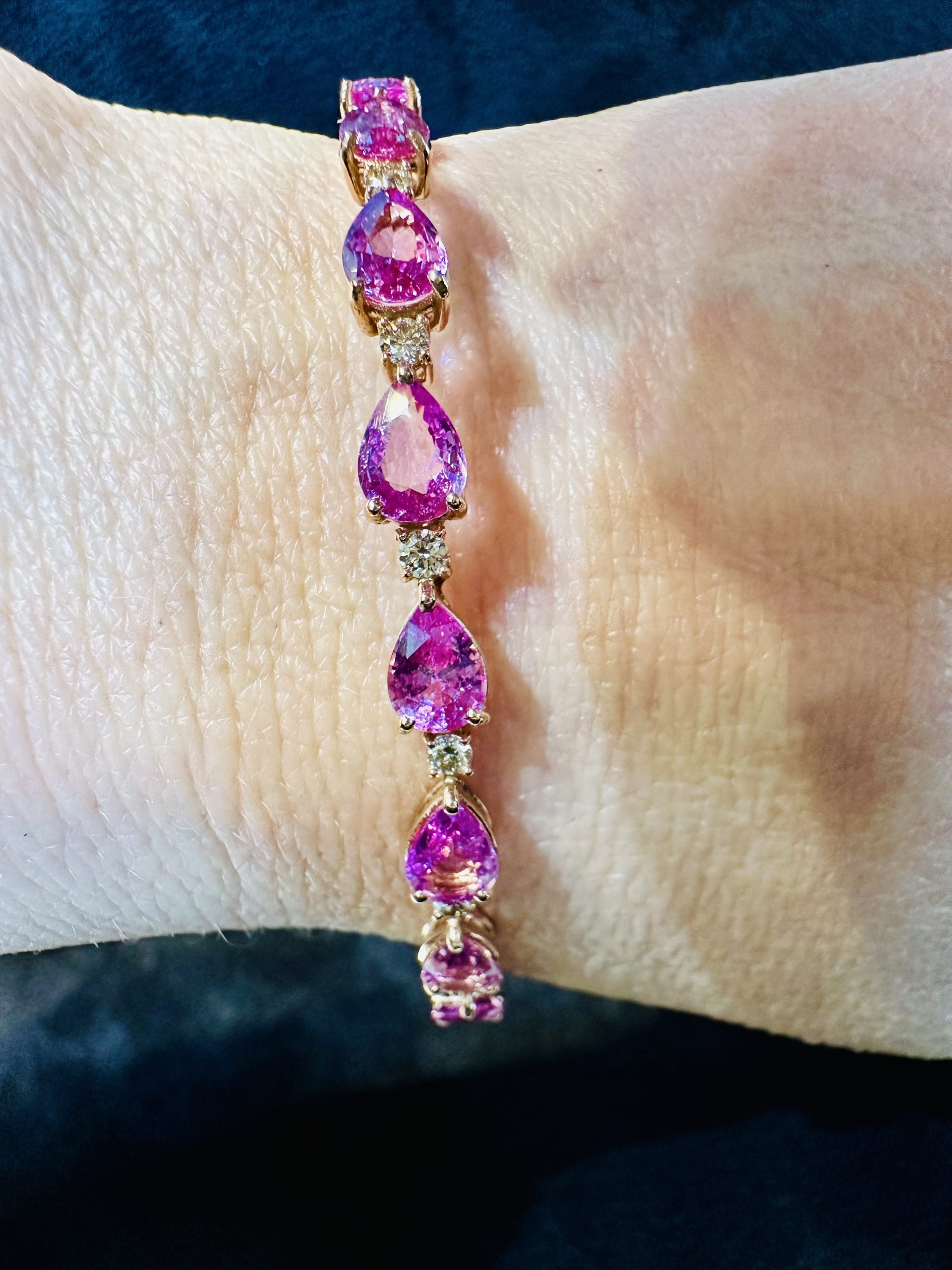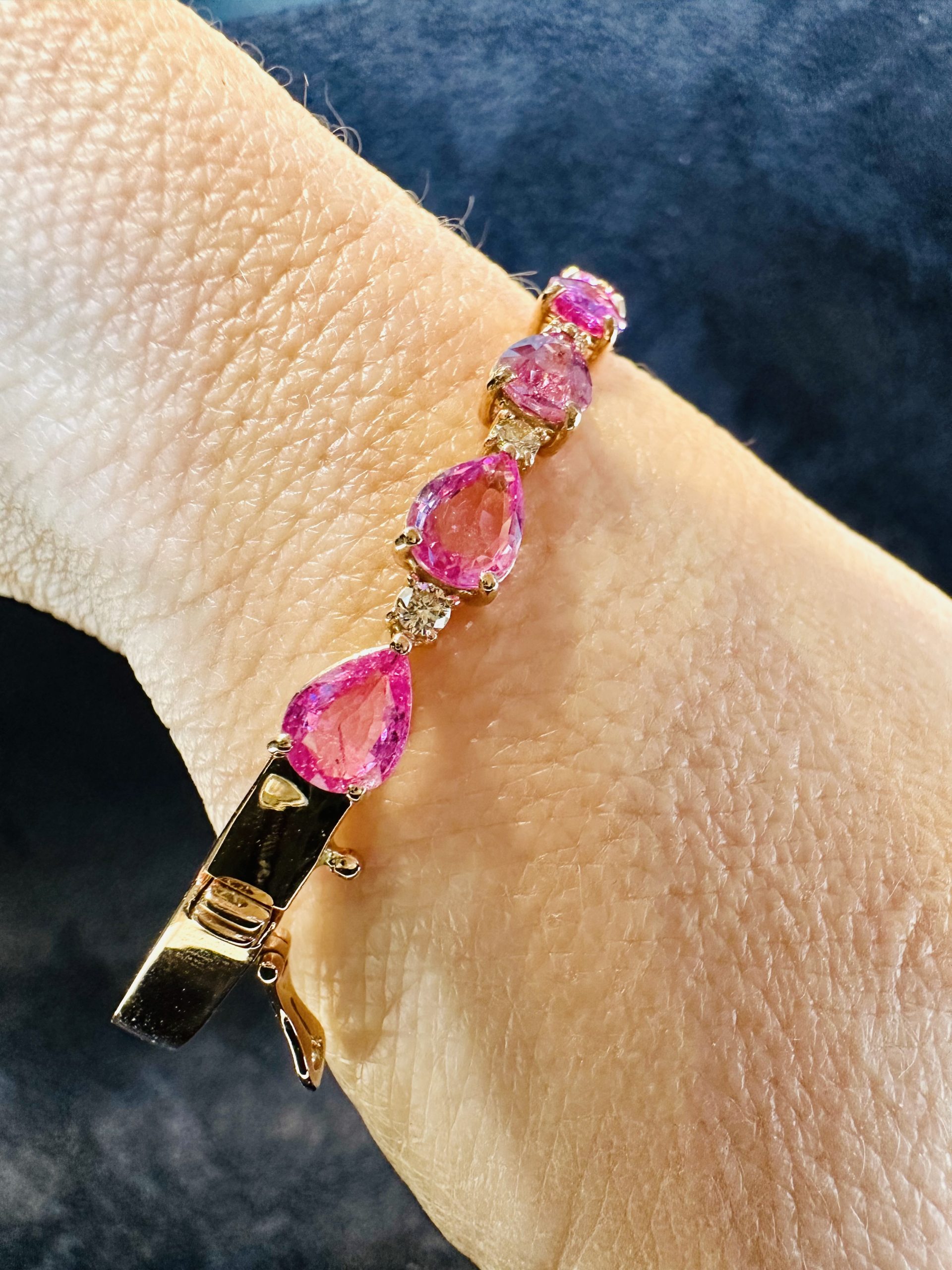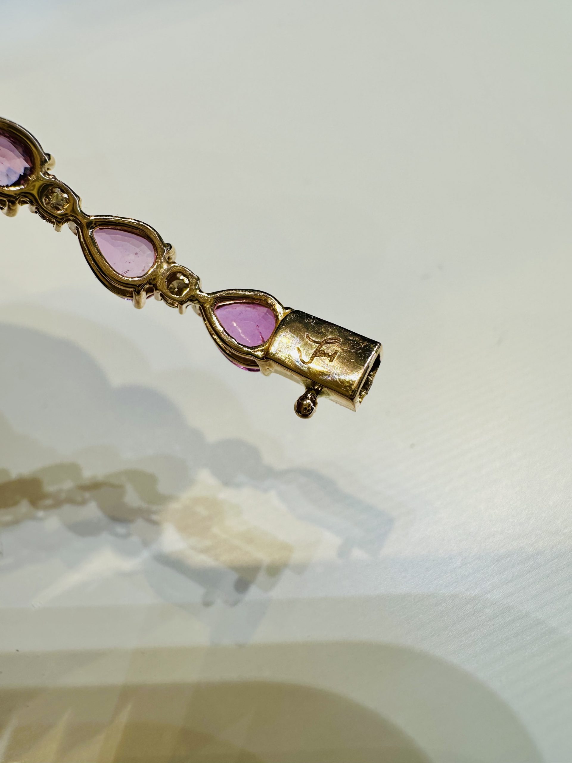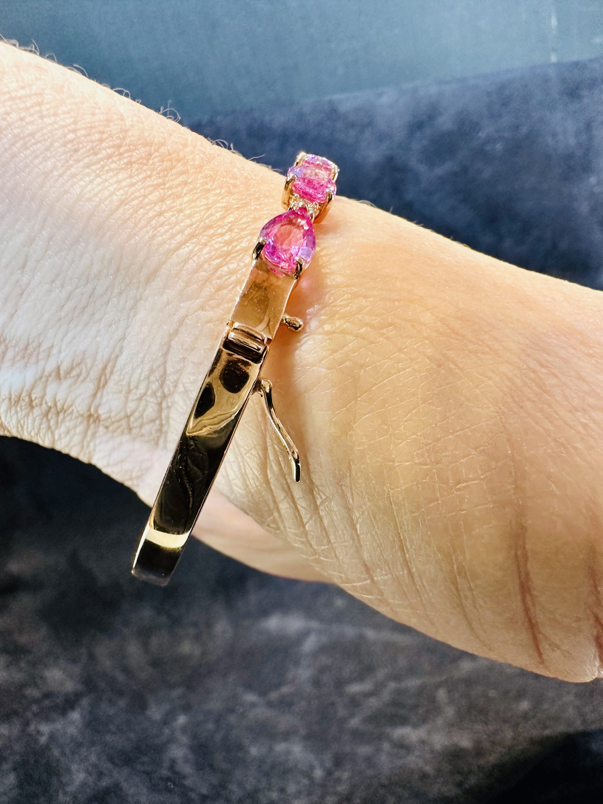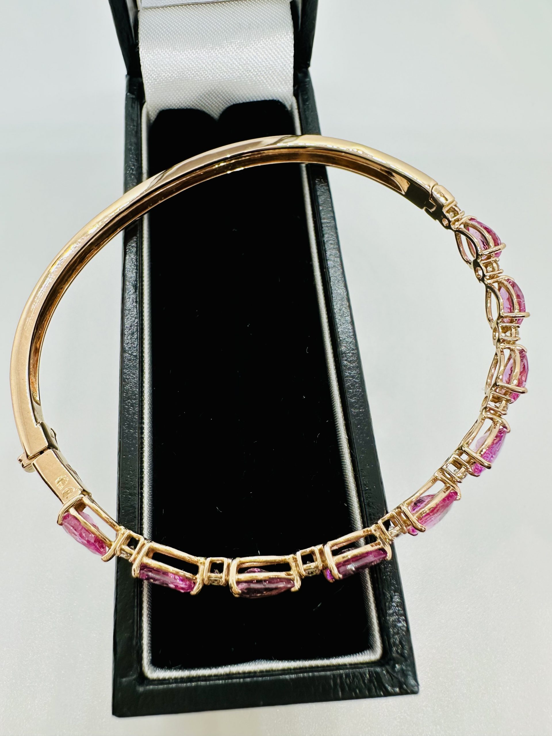 18K yellow gold, Natural Pink Sapphire & Diamond Bangle Approximate weight of Natural Pink Sapphire 6.92cts Approximate weight of Diamonds 0.50cts 18K yellow gold – 13.79g Brand : Janis